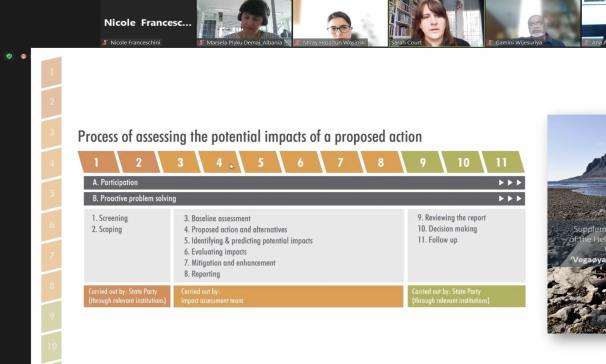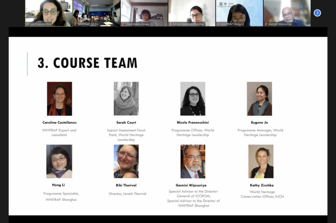 由8名导师组成的课程团队在培训中进行了在线展示与发言,包括Carolina Castellanos女士(亚太遗产中心专家和顾问)、Sarah Court女士(世界遗产领导力项目,影响评估专员)、Nicole Franceschini女士(世界遗产领导力项目官员)、Eugene Jo女士(世界遗产领导力项目主管)、李泓女士(亚太遗产中心上海中心项目专员)、Riki Therivel女士(Levett-Therivel主任)、Gamini Wijesuriya先生(国际文物保护与修复研究中心特别顾问;亚太遗产中心上海中心特别顾问)和Kathy Zischka女士(IUCN世界遗产保护官员)。25名参会者由国际文物保护与修复研究中心、亚太遗产中心上海中心或在亚太地区工作的相关机构推荐。